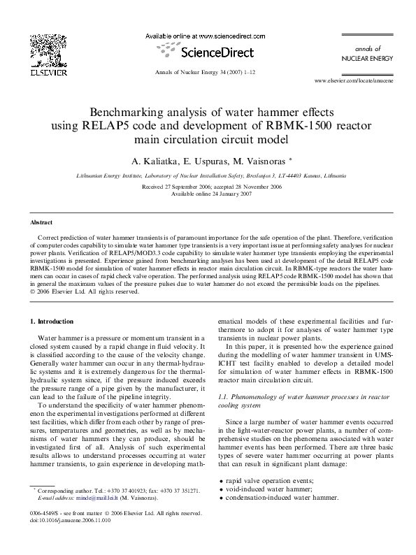 Pdf Benchmarking Analysis Of Water Hammer Effects Using Relap5 Modelling Of Thermal Hydraulic Transient Processes In Nuclear Power Plants Ignalina Compartments
